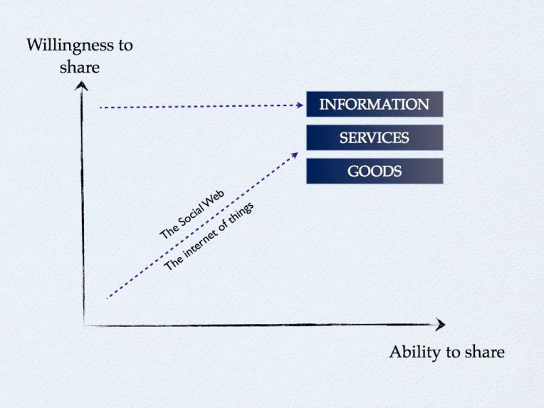One of the most powerful and disruptive aspects of the web is its ability to facilitate low effort, large scale sharing. In the beginning the primary disruption came from our new-found ability to share information. This is a force that has transformed the communications landscape forever, as well as radically altering the fortunes of the music, film and news industries.  It may, however, be only the beginning. The power of the web to enable sharing started with shared information but it isn’t stopping there.