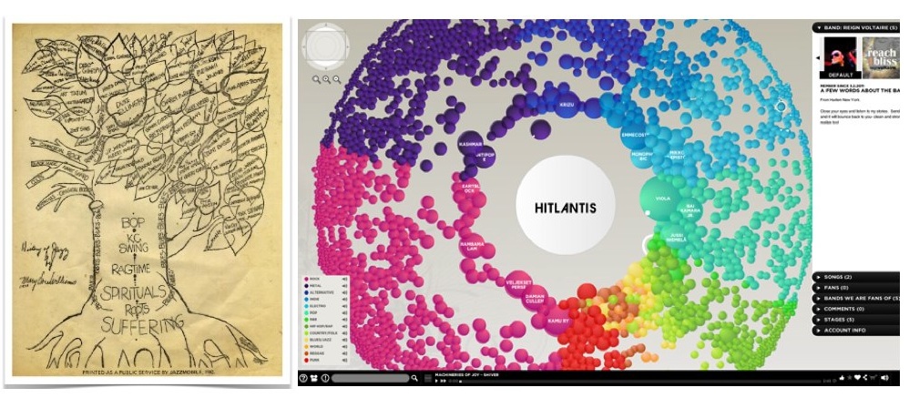 There are other tools of course too. Paul Lamere posed the fantastic question of how data visualization can enable discovery in a world of infinite abundance. Apparently 65% of the tracks users own are never listened to, suggesting we’re not able to adequately surface and discover the music we already own, never mind find more artists we might like. He showcased beautiful, hand-drawn visualizations from the jazz era and demo-ed extraordinary new approaches to surfacing and showcasing playlists, from artists’ connections to his own mind-blowing system based on acoustic similarity.